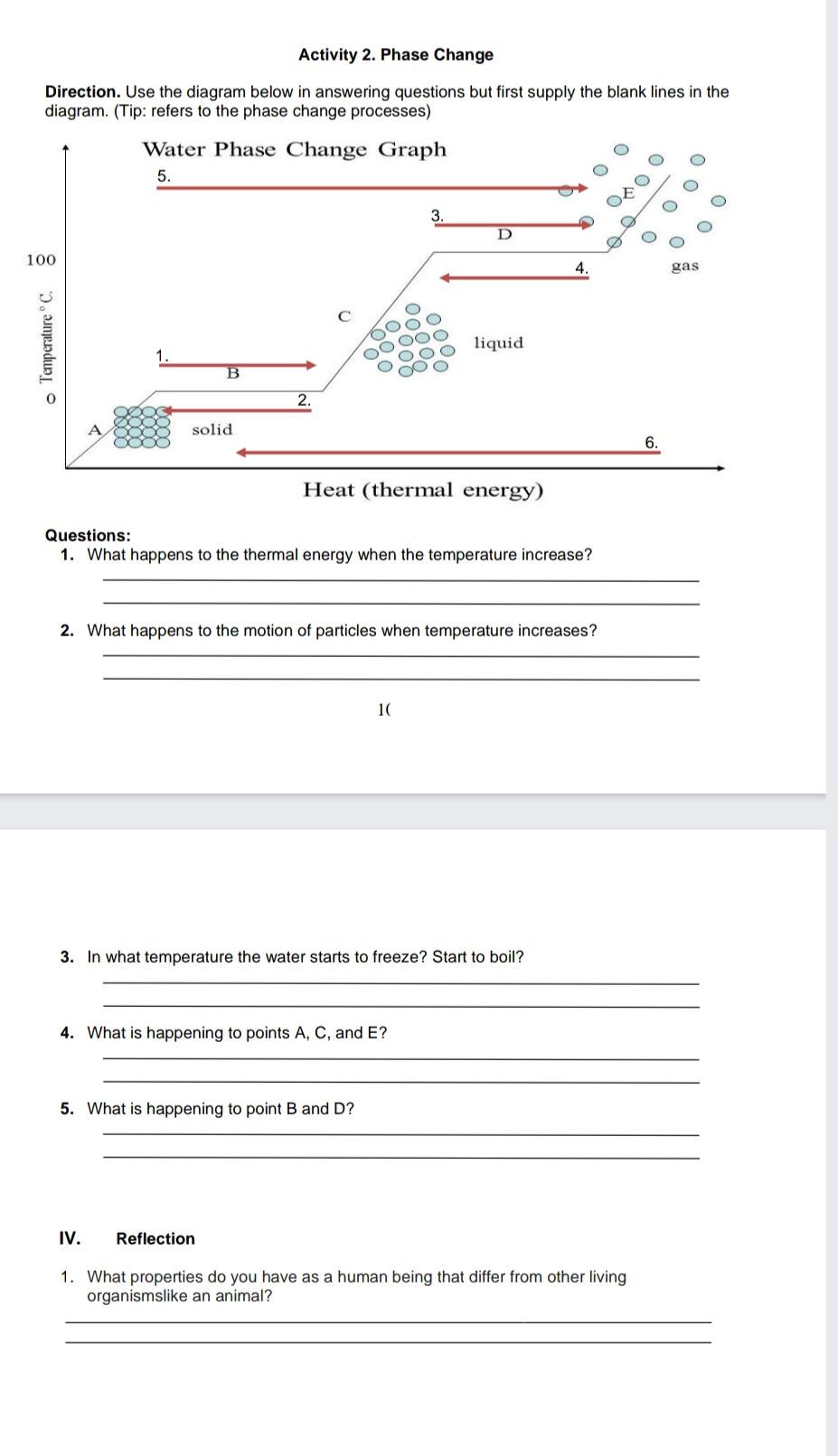 Explore how heat and temperature relate to phase changes. matter changes, but they may know that it changes state from solid to liquid to gas. 5. Recap that these are processes in the phase change cycle which they will now explore. Explore 1. Distribute the data collection sheet (Blackline Master #2). Go over the directions at the top of the sheet. Phase Change Worksheet. The graph was drawn from data collected as a substance was heated at a constant rate. Use the graph to answer the following questions. At point A, the beginning of observations, the substance exists in a solid state. Material in this phase has _____ volume and _____ shape. Phases of Matter -Phase Introduction and Phase Change Activity Introduce or review the concepts of the Phases of Matter with this reading activity and Phase Change diagram resource. Page 1- Introduction reading about the 3 main phases of matter and phase changes. "Fill In" questions included for q