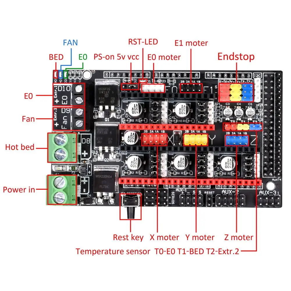 Mega2560+ramps 1.4 kit, The GT2560 can not only take full place the them on respect of both software and hardware, but also features compact size, more convenient connection, and more stable. 2. Adopt ATmega2560 as the main control chip, coupled with the high-performance USB serial converter CH340C. 3. The drawback of RAMPS 1.5 and 1.6 are that they use SMD polyfuses which are a little more difficult to replace (for some people) than the large fuses from the RAMPS 1.4. However, the fuses of the RAMPS 1.4 are sticking out, then tend to bend once in a while when you work on the board and could therefore become prone to metal fatigue and break. I ordered a RAMPS 1.6+ thinking higher is better, turns out the ramps 1.6+ is made for a TMC2130. Now I did get two TMC2130's, but i also got two DRV8825's for the Z and extruder. Anyway, that means that how to set it up is different than a regular ramps 1.4, meaning that you need to adjust a few things if you are using a A4498 or a DRV8825. RAMPS1.4 + ATX power Wiring In this case, 12V from ATX Power is supplied to 1117 regulator on Arduino through diode D1 on RAMPS1.4. The 1117 series Voltage Regulator in Arduino can operate with up to 20 V input. Therefore Arduino can work well without USB. (Standalone with an SD card)