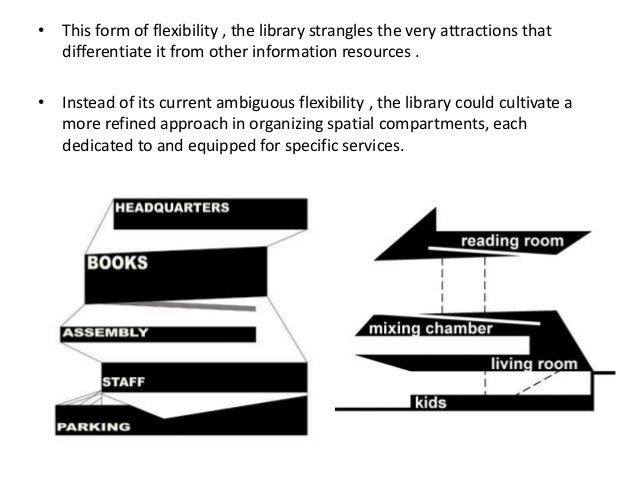 Seattle Public Library / General Information Ideas included books vs media, flexibility, and public vs private domain. "Instead of this ambiguous flexibility, the library could…[organize] itself Into spatial compartments, each dedicated to…specific duties." Similar programs were consolidated together, forming five "stable"
