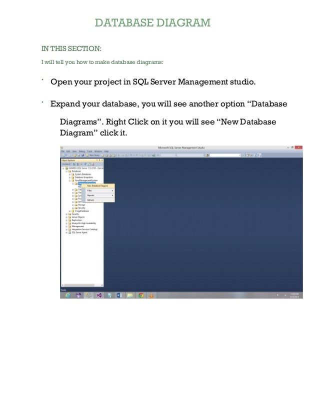 The simple answer is to look up at the menu bar in SQL Server Management Studio. When you are viewing your database diagram, a new menu appears called Database Diagrams. From the Database Diagrams menu, select the Copy Diagram to Clipboard menu option. Once you have the database diagram copied to the clipboard, you can paste it as normal into ... Open your SQL Server management studio and enter into your DB. Enter into Database Diagrams and search for diagrams. If there is no diagram, create a new diagram (right mouse click - New Database Diagram) Inside the Diagram use right mouse click, add all the relevant tables and see the relationships. How do you make a database diagram?