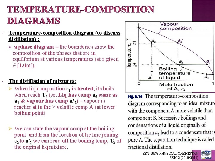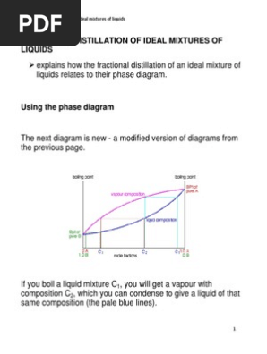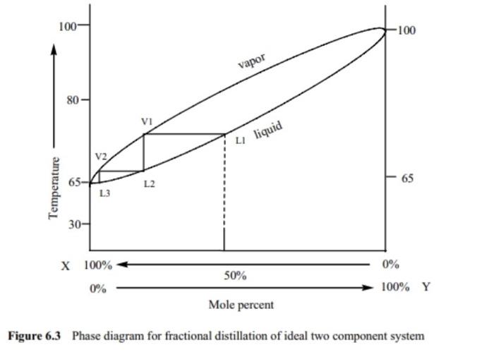 Looks at how this affects the fractional distillation of such mixtures. NON-IDEAL MIXTURES OF LIQUIDS This page looks at the phase diagrams for non-ideal mixtures of liquids, and introduces the idea of an azeotropic mixture (also known as an azeotrope or constant boiling mixture). CHM220 Distillation Lab Page 4 of 7 Figure 5b Fractional Distillation Phase Diagram. The arrows indicate a theoretical plate. Each vaporization is represented by a horizontal line connecting the liquid composition curve to the vapor composition curve. Each condensation is represented by a vertical line connecting the Distillation Distillation is a commonly used method for purifying liquids and separating mixtures of liquids into their individual components. Familiar examples include the distillation of crude fermentation broths into alcoholic spirits such as gin and vodka, and the fractionation of crude oil into useful products such as gasoline and heating oil. Phase diagrams for fractional distillation. I learned about phase diagrams involving partial Vapour composition, temperature and composition of binary solutions from this website. You can find it if you scroll down to a little above the end. First it considers a binary solution of volatile liquids. The diagram involves boiling point on Y-axis ...