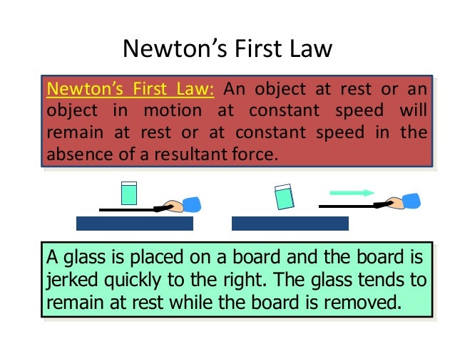 Examples of Newton's First Law of Motion 1. Brakes applied by a Bus Driver Abruptly. While travelling on a bus, when the bus driver abruptly applies the breaks, we tend to feel a momentary pull in the forward direction. The reason behind this jerk felt by the passengers sitting inside the bus is the law of inertia.