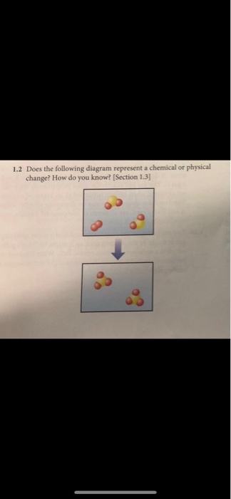 Problem: (a) Does the following diagram represent a chemical or physical change? FREE Expert Solution. Physical change → there is a change in a matter as it goes from one physical state to another. no change in chemical composition; Chemical change → atoms rearrange themselves to create a new substance.