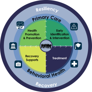 continuum of care. The Behavioral Health Continuum of Care Model helps us recognize that there are multiple opportunities for addressing behavioral health problems and disorders. Based on the Mental Health Intervention Spectrum, first introduced in a 1994 Institute of Medicine report, the model includes these components: