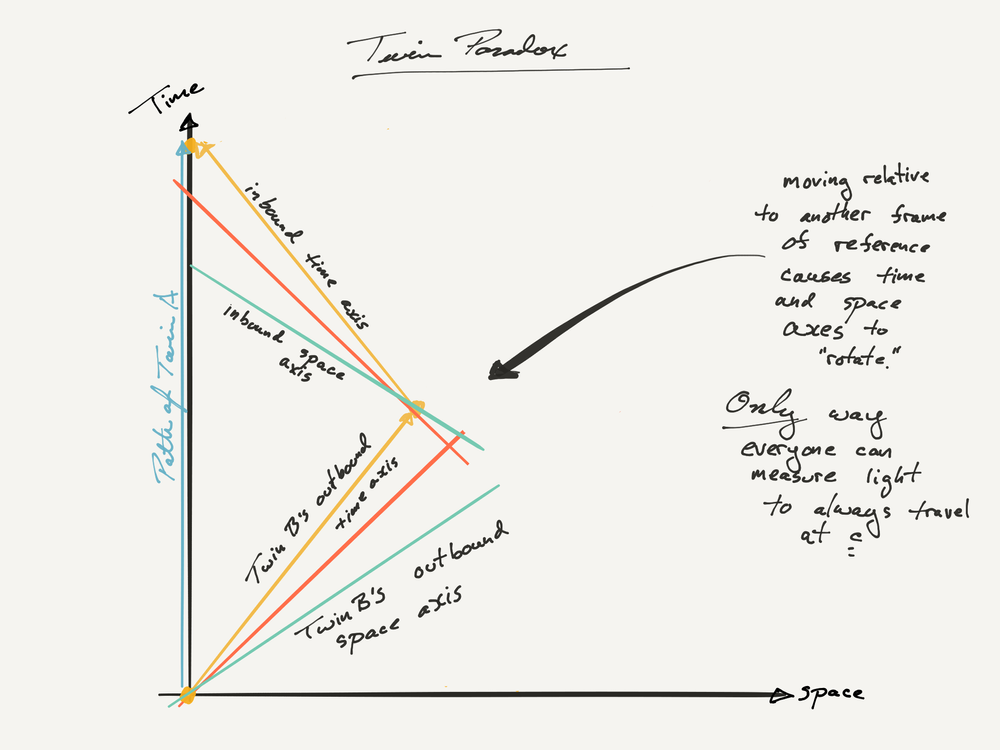 Twin paradox spacetime diagram. Diffraction Meaning In Physics Terms; Diffraction Meaning In Physics Worksheet; Physics is a scientific discipline that seeks to construct and experimentally test theories of the physical universe. paradoxes, including the famous twin paradox, the "pole-in-the-barn" paradox, and the Loedel diagram, which is an accessible, graphic approach to relativity. Students of the history and philosophy of science will welcome this concise introduction to the central concept of modern physics. Spacetime Diagram 5m. ... Twin Paradox Revisited (* optional video) 4m. Causality 11m. No Perfect Rigid Body 3m. Ladder Paradox 9m. Lorentz Transform, Space Part 6m. implications. He explores illuminating paradoxes, including the famous twin paradox, the "pole-in-the-barn" paradox, and the Loedel diagram, which is an accessible, graphic approach to relativity. Students of the history and philosophy of science will welcome this concise introduction to the central concept of modern physics.