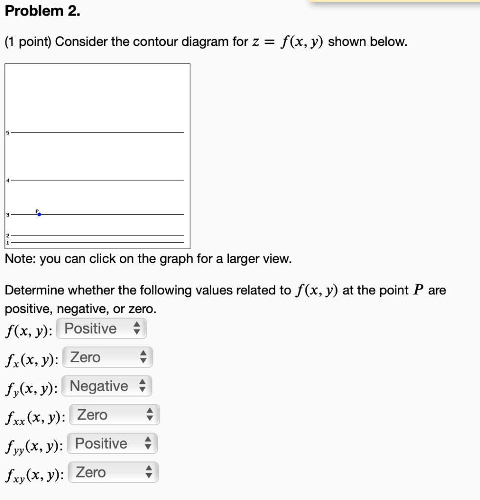 [Calc 3] Need help figuring out a contour diagram : learnmath The figure below shows contours of f(x,y)=140ex − 130y2. Find the values of f on the contours. They are equally spaced multiples of 10. I got A. I … (d) Consider the function g : ℝ → ℝ, given by f(x) = x^2 + 1. Is it true that f = g? No. f and g have different domains, as well as codomains. f ⊆ g, but both f...