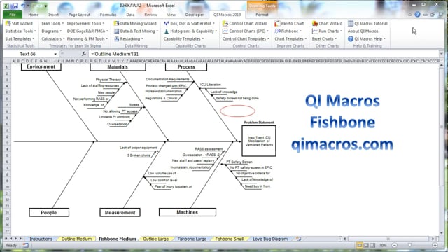 Fishbone Diagram Template (Automated) in Excel using QI ... Create an Ishikawa/Fishbone Diagram in Excel using the QI Macros Template:1. Enter problem statement in Cell A2 for the head of the fish2. Select a style of ...
