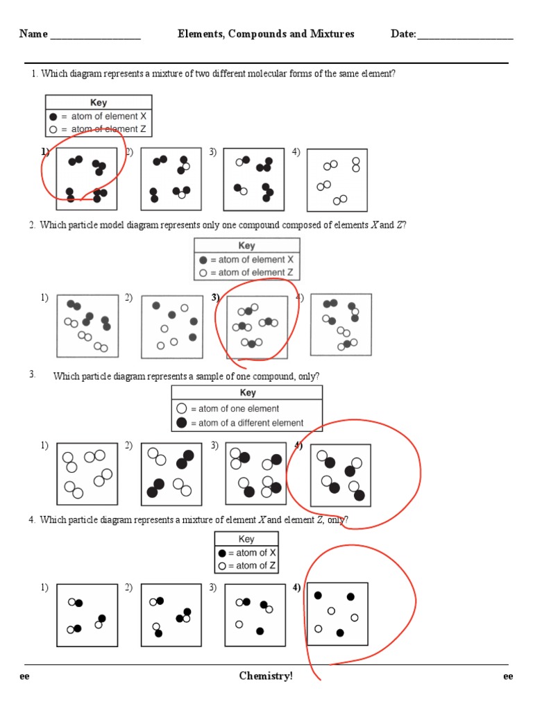 Elements, Compounds, and Mixtures - SAS Compound formula: Represents the combination of two or more elements in fixed proportions. Students learn the difference between a pure substance and a mixture. They will then be able to Suspensions have particles that are large enough to settle to the bottom and can therefore be filtered... PDF More Particle Modeling Key 4 The particle diagram below represents a sample of matter. Which diagram for the products of the reaction demonstrates the Law of Conservation of Mass? Which best describes the composition of the sample? (1) a heterogeneous mixture of elements and compounds.
