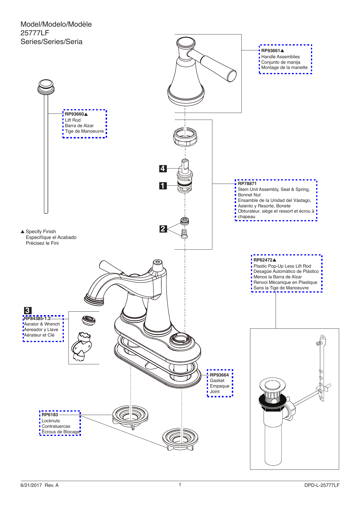 media.deltafaucet.com › PartsDiagram › DPD-L-B510LFB510LF, B512LF, B501LF, B501LF-LH ... - Delta Faucet Company RP42847 Lift Rod Barra de Alzar Tige de Manoeuvre Specify Finish Especifíque el Acabado Précisez le Fini RP41661 Knob Handle w/Button, Screw, Connector and Set Screw