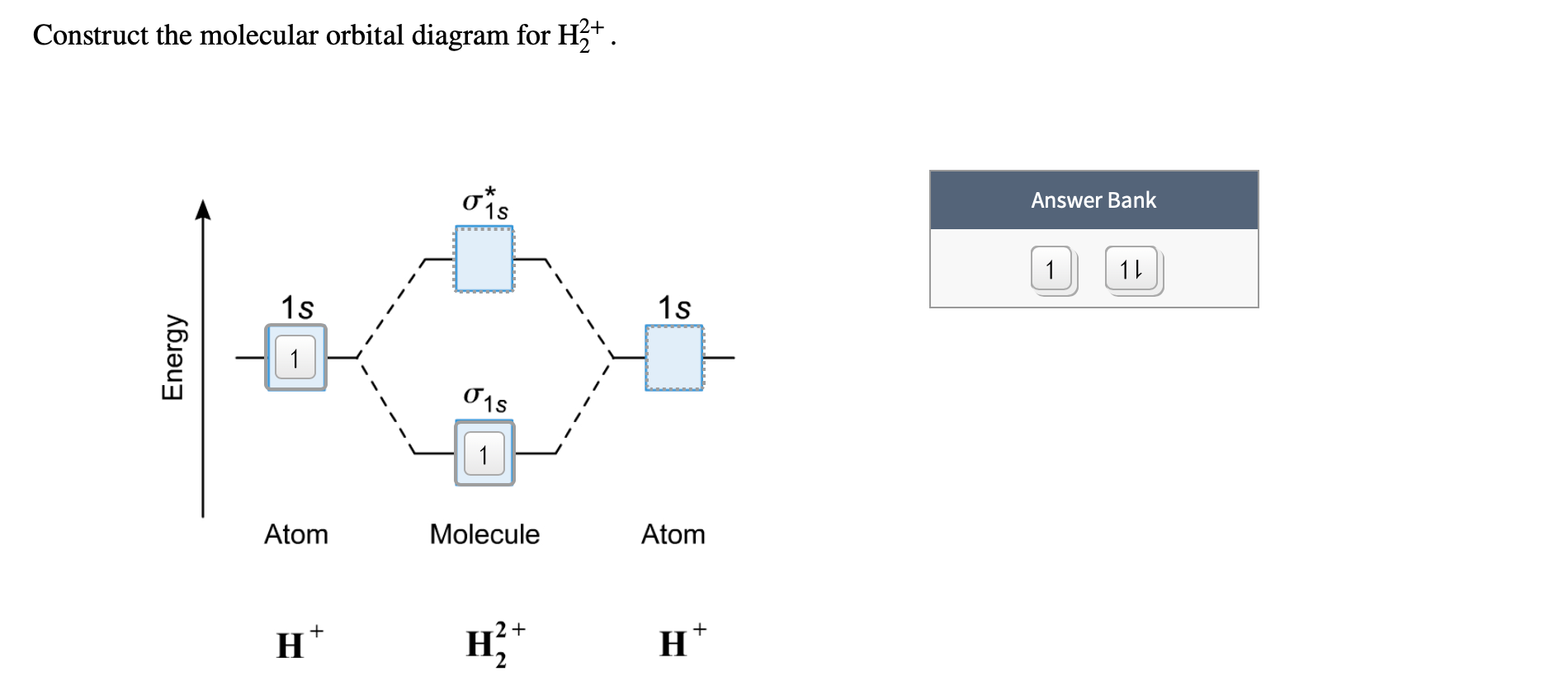 2.5.5: Molecular Orbital Diagrams - Chemistry LibreTexts Molecular Orbital Diagrams. This scheme of bonding and antibonding orbitals is usually depicted by a molecular orbital diagram such as the one shown here for the dihydrogen ion H2+. Atomic valence electrons (shown in boxes on the left and right) fill the lower-energy molecular orbitals before the higher ones, just as is the case for atomic ...